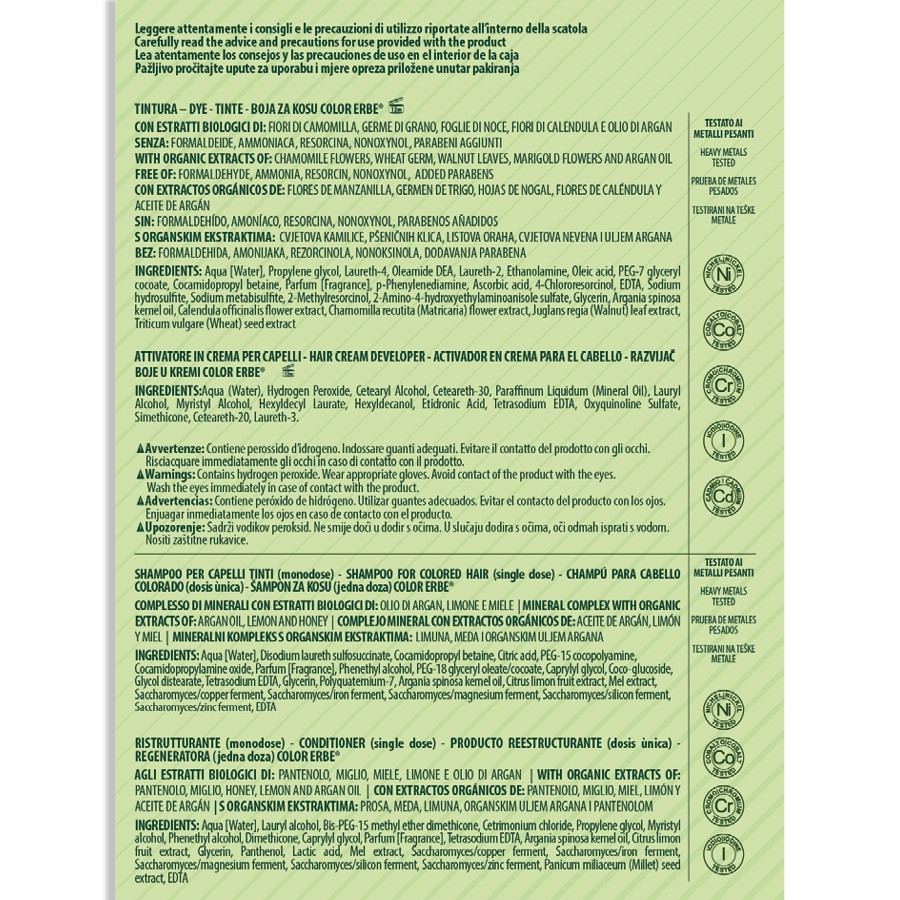 NAHRAZUJE CLASSICO No.09. Bez amoniaku, resorcinolu, nonoxynolu, parabenů a formaldehydu je barva COLOR ERBE a avantgardní barvou na vlasy, vždy připravena zaručit kvalitu a bezpečnost. VEGAN. Podrobné informace