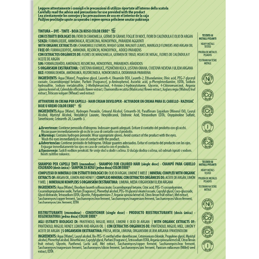 NAHRAZUJE BARVY CLASSICO No.08. Bez amoniaku, resorcinolu, nonoxynolu, parabenů a formaldehydu je barva COLOR ERBE a avantgardní barvou na vlasy, vždy připravena zaručit kvalitu a bezpečnost. VEGAN. Podrobné informace
