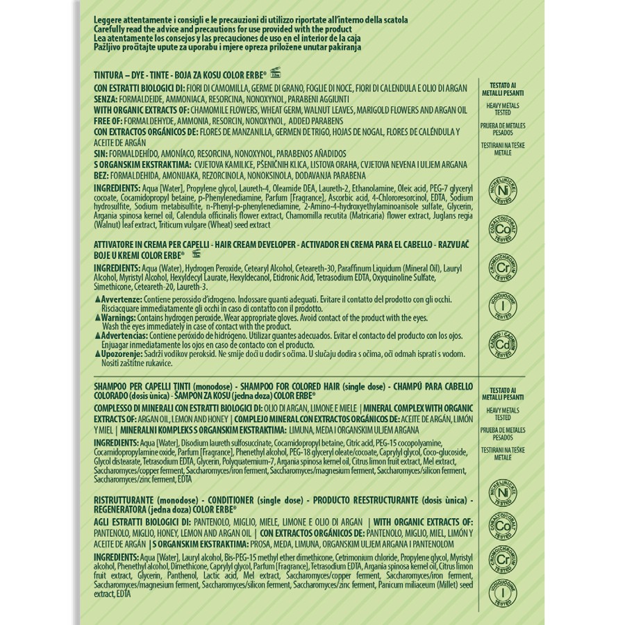 Bez amoniaku, resorcinolu, nonoxynolu, parabenů a formaldehydu je barva COLOR ERBE a avantgardní barvou na vlasy, vždy připravena zaručit kvalitu a bezpečnost. VEGAN.