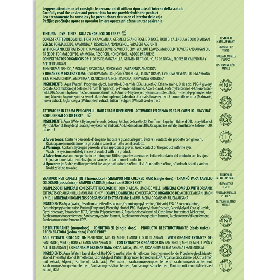 Bez amoniaku, resorcinolu, nonoxynolu, parabenů a formaldehydu je barva COLOR ERBE a avantgardní barvou na vlasy, vždy připravena zaručit kvalitu a bezpečnost. VEGAN.