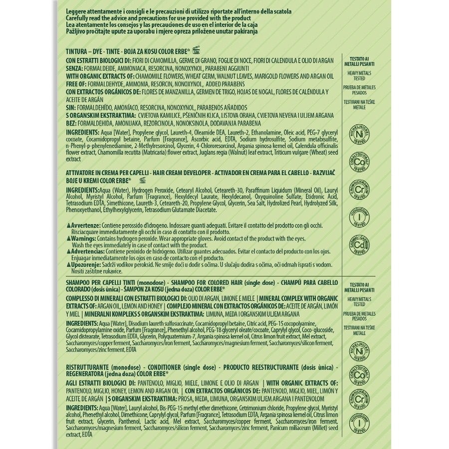 Bez amoniaku, resorcinolu, nonoxynolu, parabenů a formaldehydu je barva COLOR ERBE a avantgardní barvou na vlasy, vždy připravena zaručit kvalitu a bezpečnost. VEGAN.