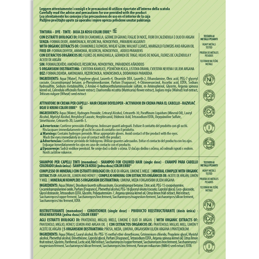 NAHRAZUJE BARVU CLASSICO No.26. Bez amoniaku, resorcinolu, nonoxynolu, parabenů a formaldehydu je barva COLOR ERBE a avantgardní barvou na vlasy, vždy připravena zaručit kvalitu a bezpečnost. VEGAN. Podrobné informace